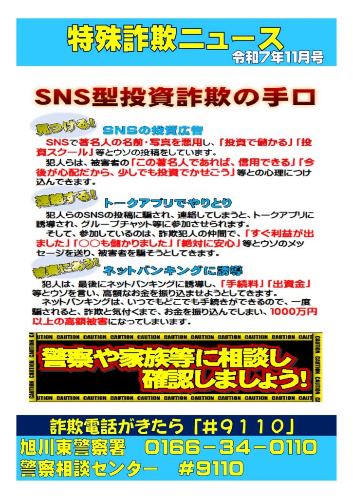 旭川東警察署からSNS型投資詐欺に関する注意喚起がありました。